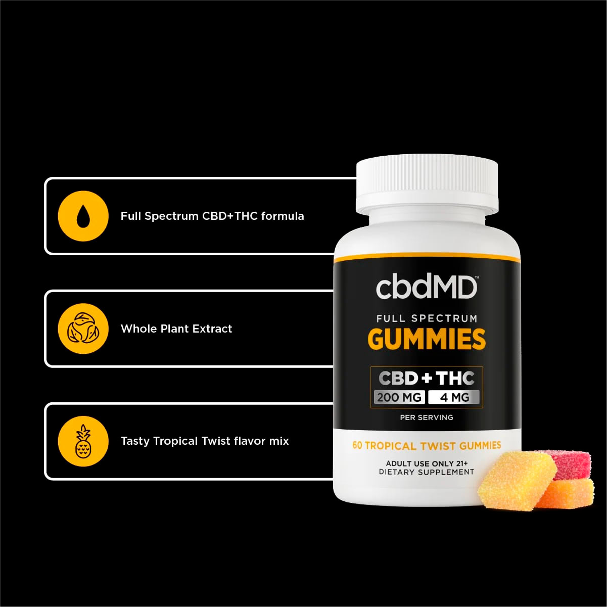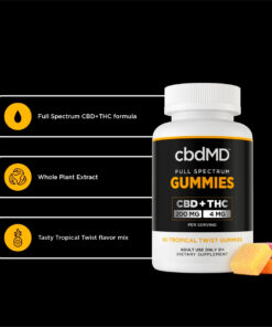 Full spectrum CBD + THC gummies provide a convenient and tasty way to bring CBD into your daily routine, and cbdMD’s gummies are made with special attention to quality. Our full spectrum hemp extract comes from non-GMO hemp grown in the USA in accordance with federal standards, and is carefully refined and tested.